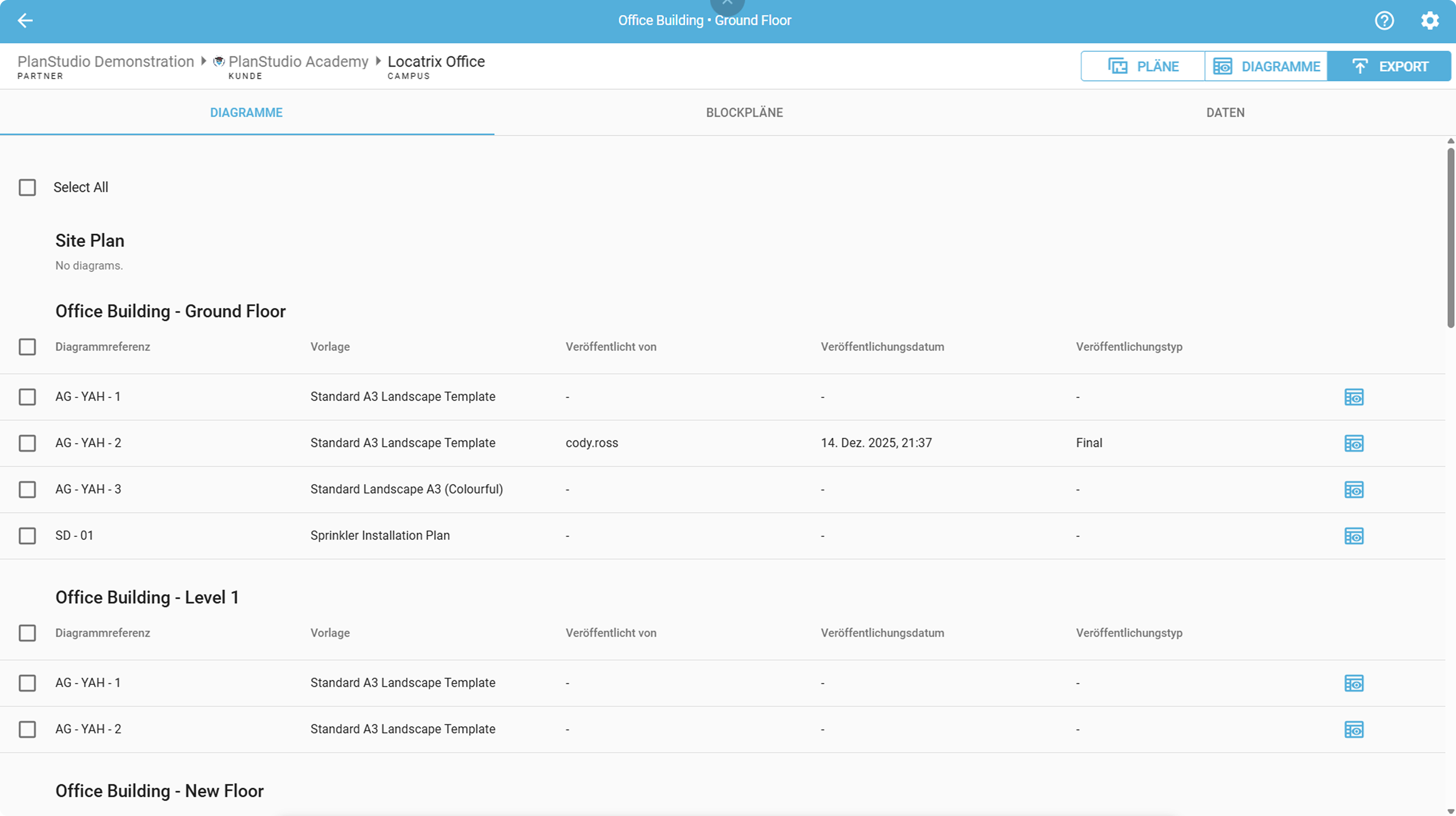 Ein neuer Exportieren-Tab wurde dem Plan- und Diagrammeditor hinzugefügt, um Diagramme und Daten für den gesamten Campus einfach zu exportieren.